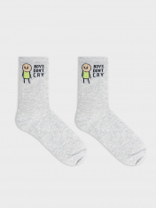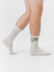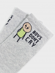 Высокие носки мужские с плотным бортом и рисунком в виде надписи "BOYS DON`T CRY / Парни не плачут" — отличная возможность внести разнообразие в свой стиль и поднять настроение. Изготовлены из гребенного хлопка — пряжи высочайшего качества, мягкой, тонкой, но прочной. Натуральные волокна отлично пропускают воздух, позволяя коже дышать, и впитывают влагу, дарят ощущение комфорта в течение всего дня. Благодаря небольшому количеству эластана в составе, длинные носки хорошо облегают стопу и сохраняют форму даже после множества стирок. Мягкая эластичная резинка надежно удерживает носки на ноге, но не давит. Пятка и мысок дополнительно усилены, что гарантирует защиту от протирания и повышенную износостойкость — мужские носки с принтом прослужат долго. Лучший выбор на каждый день. Рекомендуем!