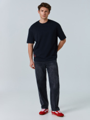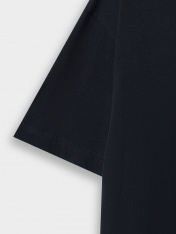 Футболка прямая свободная. Горловина округлой формы обработана обтачкой из рибаны. Шов втачивания обтачки по спинке закрыт бейкой из основного полотна. Линия плеча слегка спущена. Рукава втачные, корткие. Нижние срезы футболки и рукавов обработаны швом вподгибку на 2х шовной плоскошовной машине._x000D_ _x000D_ _x000D_ _x000D_