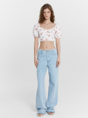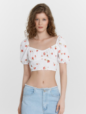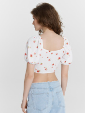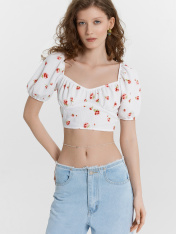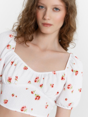 Этот женский укороченный топ — воплощение изящности и нежности, созданный для стильных и легких образов. Короткие объемные рукава, обработанные эластичной тесьмой, добавляют романтичности и воздушности, а глубокий вырез горловины с изящной сборкой подчеркивает женственность. Отрезной лиф и сборка под грудью создают красивый силуэт, который гармонично дополняется глубоким вырезом на спинке. Нижний край обработан швом вподгибку с эластичной тесьмой, что обеспечивает идеальную посадку. Изделие выполнено из ткани рашель — материала, отличающегося легкостью, мягкостью и элегантной текстурой. Этот топ идеально подойдет для стильных летних образов, вечерних выходов или романтичных встреч, даря комфорт и красоту в каждом движении._x000D_ _x000D_ _x000D_ _x000D_ _x000D_ _x000D_ _x000D_