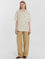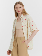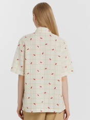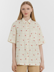 Блузка женская свободного силуэта из ткани. Блузка с цельнокроеной планкой и центральной застежкой на пуговицы. На левой детали переда накладной карман. Горловина круглой формы с рубашечным воротником. Плечо спущено, пройма углублена. Рукав втачной,короткий. Низ рубашки прямой.