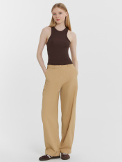 Топ прилегающего силуэта. Округлый вырез горловины с «американской» проймой. Пройма и горловина окантованы бейками в 3 сложения из основного полотна. Нижний срез переда фигурный. Нижний срез топа обработан швом вподгибку на 2х иглольной плоскошовной машине.