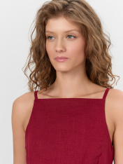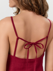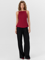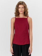 Женский топ с открытой спинкой — это изящная и эффектная модель, идеально подходящая для летнего гардероба или особых случаев. Полуприлегающий силуэт подчеркивает фигуру, оставаясь при этом комфортным в носке. Тонкие бретели придают образу легкость,а глубокий вырез на спинке делает акцент на женственности и утонченности. Изделие выполнено на подкладке из основного материала, что обеспечивает дополнительную плотность и аккуратную посадку. Потайная молния в боковом шве делает надевание удобным исохраняет чистоту линий. Натуральные волокна рами и лиоцелла в составе ткани придают изделию приятную текстуру, воздухопроницаемость и легкий благородный блеск. Такой топ легко комбинируется с юбками, брюками или шортами, позволяя создавать как повседневные, так и вечерние образы.