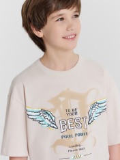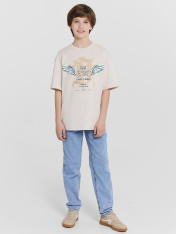 Футболка прямого силуэта. Перед и спинка цельнокроенные. Горловина круглой формы, широкая бейка из рибаны. Рукав втачной, широкий. Футболка слегка укорочена. Подгибки низа и рукава широкие.