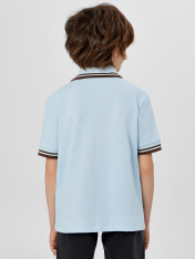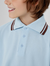 Поло свободного силуэта, перед и спинка цельнокроеные. По переду обработана застежка «поло» на 3 петли и пуговицы (d=10мм). Горловина с воротником стойкой из довяза DVС-100/001-0/5. Рукав втачной, одношовный, плечо спущено. Низу рукава - довяз DM2С-35/001-0/5. Низ изделия обработан швом в подгибку.