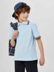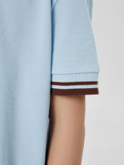 Поло свободного силуэта, перед и спинка цельнокроеные. По переду обработана застежка «поло» на 3 петли и пуговицы (d=10мм). Горловина с воротником стойкой из довяза DVС-100/001-0/5. Рукав втачной, одношовный, плечо спущено. Низу рукава - довяз DM2С-35/001-0/5. Низ изделия обработан швом в подгибку.