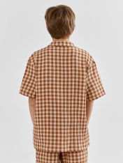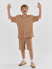 Сорочка верхняя для мальчиков прямого силуэта с воротником. По переду обработана застежка на пуговицы d=10mm и петли. Рукава короткие, втачные, слегка спущены. Нижние срезы изделия и рукавов обработаны швом в подгибку._x000D_