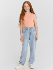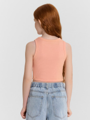 Топ для девочек прилегающего силуэта. Горловина круглая. Проймы и горловина окантованы бейкой из основного полотна. Низ изделия обработан швом в подгибку.