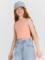 Топ для девочек прилегающего силуэта. Горловина круглая. Проймы и горловина окантованы бейкой из основного полотна. Низ изделия обработан швом в подгибку.