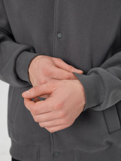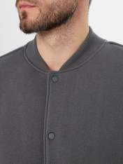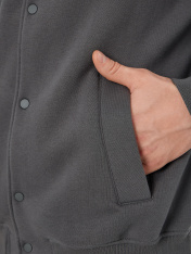 Жакет изготовлен из трикотажного полотна футер._x000D_ Жакет прямого силуэта свободный, длиной до середины бедер._x000D_ Горловина округлой формы с воротником стойкой - довяз. Шов втачивания воротника по спинке закрыт тесьмой хб. Рукава втачные, длинные. По низу рукавов отрезные манжеты._x000D_ По переду обработаны прорезные карманы с листочкой. Подкладка кармана из кулирки._x000D_ Центральная застежка на кнопки._x000D_ Пояс,манжеты и воротник - довяз._x000D_ _x000D_ _x000D_ _x000D_