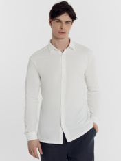 Рубашка мужская изготовлена из трикотажного полотна пике. Модель полуприлегающего силуэта, длиной до середины бедер. Плечевые швы смещены в сторону переда. Рукава втачные длинные, с отрезными манжетами на застежке на петлю и пуговицу. Горловина округлой формы с рубашечным воротником. Спереди есть застежка на планке на петли и пуговицы. По спинке отрезная кокетка. Стильная лаконичная рубашка (сорочка) мужская, которая идеально впишется в офисные аутфиты, подойдет для деловых и casual образов. Дополнить можно джинсами или брюками на свой вкус. Широкий размерный ряд. Рекомендуем!
