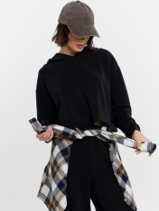 Укороченное женское худи для модниц, которые ценят комфорт и стиль. Выполнено из высококачественного материала. Мягкий, приятный на ощупь модал в составе изделия, создает ощущение уюта и обеспечивает отличную воздухопроницаемость. Дарит максимальныйкомфорт во время носки. Укороченный силуэт худи не сковывая движений. Отличается современным дизайном и актуальными деталями. Лаконичный крой и высокое качество исполнения делают это худи с капюшоном настоящим must-have в гардеробе любой девушки. Широкий размерный ряд. Рекомендуем!