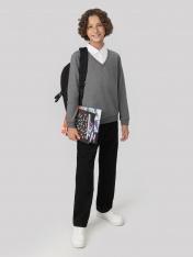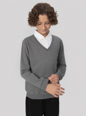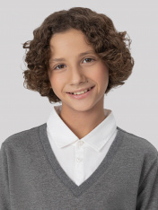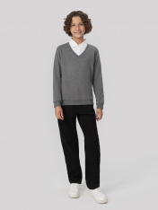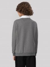 Джемпер для мальчиков из трикотажного футера — это воплощение повседневной элегантности с легким намеком на классику. Благодаря V-образной горловине он смотрится более собранно, а декоративная манишка с воротником и планкой на пуговицах добавляет нарядности, делая модель похожей на стильный ансамбль в духе школьной формы. Длинные рукава завершены манжетами из рибаны, что не только удобно, но и визуально подчеркивает структуру, придавая образу завершенность. Такой же пояс по нижнему краю джемпера аккуратно фиксирует посадку и делает силуэт цельным. В результате модель выглядит уместно и в учебное время, и на прогулке — сдержанная, но с характером.