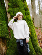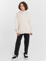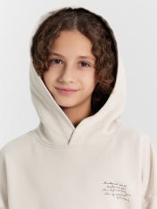 Анорак изготовлен из трикотажного полотна футер. Анорак свободного силуэта (оверсайз), с капюшоном. Горловина округлой формы. Капюшон со средним швом, на подкладке из осн. полотна. Плечо спущено, рукав втачной длинный. По низу рукава отрезная манжета из рибаны. По переду настрочен карман кенгуру. Пояс отрезной из рибаны, отстрочен.