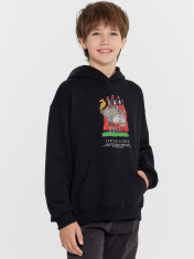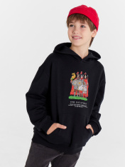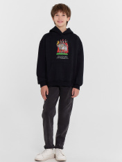 Худи для мальчиков, свободного силуэта (оверсайз), с капюшоном. Горловина округлой формы. Капюшон со средним швом, на подкладке из основного полотна. Шов втачивания капюшона закрыт хб тесьмой. Плечо спущено, рукав втачной длинный. По низу рукава отрезная манжета из рибаны. Пояс отрезной из рибаны, отстрочен. По переду карман кенгуру.