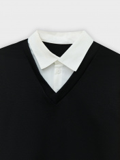 Джемпер прямого силуэта. Горловина V-образной формы с притачными бейками из основного полотна. В горловину по переду втачена декоративная манишка с воротником-стойкой и планкой с пуговицами d=10. Рукава втачные, длинные. По низу рукава манжета из основного полотна. По низу изделия притачной пояс из основного полотна._x000D_