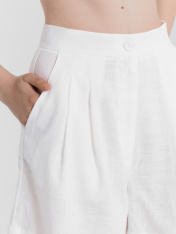 Шорты женские из ткани, с посадкой на линии талии. _x000D_ Верхний срез обработан отрезным поясом из основного полотна. Центральная застежка на молнию и пуговицу. Пуговица. На передних половинках обработаны косые карманы от пояса к боковым швам с отрезным бочком. По верхнему срезу заложены по две односторонние складки._x000D_ На задних половинках обработаны талевые вытачки._x000D_ Низ обработан швом вподгибку с закрытым срезом, с широкой подгибкой_x000D_ _x000D_ _x000D_