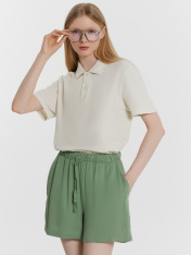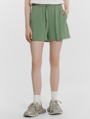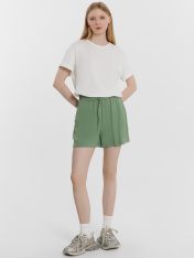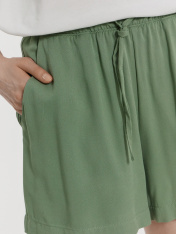 Шорты женские свободного силуэта из ткани. На детали переда карманы с отрезным бочком. Пояс отрезной с эластичной тесьмой внутри, на поясе пробиты петли и вставлен шнур из основного полотна. Шов втачивания пояса распошит. Шорты немного расширяются к низу. Длина выше колена.