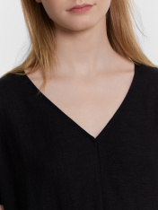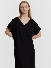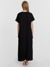 Платье прямого силуэта, длина макси. По переду и спинке средний шов. Горловина V-образной формы. Вырез горловины обработан в чистый край. Рукава цельнокроеные, обработаны в чистый край. По боковым швам разрезы. Низ платья обработан швом в подгибку.
