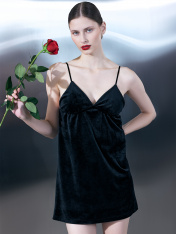 Велюровое домашнее мини платье сочетает в себе изящность и комфорт. Модель полуприлегающего кроя с V-образным вырезом и регулируемыми бретелями обеспечивает идеальную посадку и подчеркивает женственность. Чашки с подкладкой из кулирного полотна добавляют дополнительный комфорт и поддержку. Велюр, используемый для пошива этого платья, обладает рядом преимуществ. Он мягкий и приятный на ощупь, что делает платье идеальным для домашнего отдыха. Ткань также отличается долговечностью и устойчивостью к износу, что гарантирует длительный срок службы изделия. Это платье станет отличным выбором для тех, кто ценит удобство и стиль в домашней одежде.