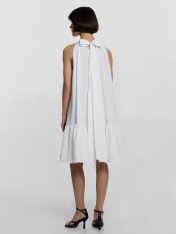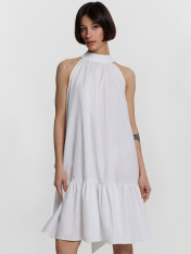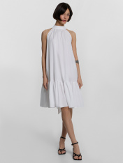 Изящный женский сарафан А-силуэта — стильное и воздушное решение для повседневных образов, сочетающее элегантность и комфорт. Свободный крой создает легкость и непринужденность, а длина выше колена подчеркивает женственность и универсальность модели. Воротник-стойка плавно переходит в завязки на спине, добавляя изысканный акцент, а углубленные проймы обеспечивают комфорт и свободу движений. Спинка со средним швом придает структуру и гармонично дополняет силуэт. Широкая рюша по низу платья делает образ нежным и романтичным, добавляя легкости дизайну. Нижние срезы обработаны швом вподгибку, что обеспечивает аккуратность и долговечность изделия. Выполненный из хлопка, сарафан обладает мягкостью, воздухопроницаемостью и приятными тактильными свойствами, идеально подходя для жаркого сезона и комфортного ношения!_x000D_ _x000D_ _x000D_