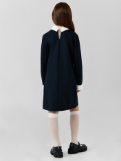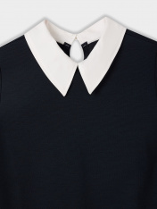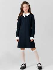Платье для девочек полуприлегающего силуэта из трикотажного полотна._x000D_ Горловина круглой формы с воротником из поплина _x000D_ с цельнокроенной стойкой. Рукав втачной, длинный, чуть расширяющийся к низу. По низу рукава отрезная манжета из поплина с разрезом._x000D_ Платье к низу немного расширяется. _x000D_ Длина платья выше колена.