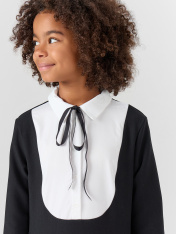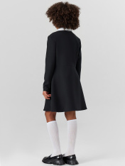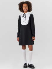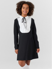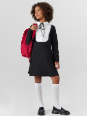 Платье для девочек полуприлегающего силуэта — это изящная модель с нотками классики, которая идеально подойдет для школы, праздников и повседневных образов. Длина выше колена делает силуэт мягким и актуальным, а круглая горловина с воротником и текстильной вставкой добавляет наряду стиль "рубашки", создавая аккуратный и собранный образ. Такая деталь придает платью особую выразительность, не перегружая его. Центральная застежка на пуговицы — не только практичный элемент, но и декоративная часть дизайна, которая создает визуальное равновесие. Длинные рукава делают платье подходящим для межсезонья, а обработка низа швом в подгибку — гарантия аккуратности, формы и долговечности. Изделие выполнено из прочного смесового материала, который сочетает комфорт натуральных волокон с устойчивостью синтетических — он хорошо держит форму, устойчив к износу и приятен к телу. Платье легко комбинируется с обувью на каждый день, жакетами, кардиганами или пиджаками, становясь универсальным элементом детского гардероба._x000D_