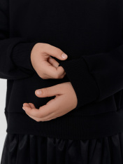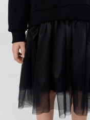 Платье для девочек свободного силуэта. Рукава втачные длинные, с отрезными манжетами из рибаны. Плечо слегка спущено. Горловина округлый формы с обтачкой из рибаны. Низ изделия обработан рибаной .