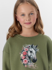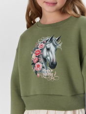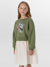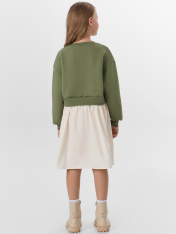 Платье свободного силуэта из футера и поплина. Горловина круглой формы, обтачка из рибаны. Платье отрезное по линии талии, низ платья из поплина на сборке. Рукава длиные, втачные. Линия плеча спущена. По низу рукавов притачены манжеты из рибаны.