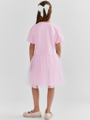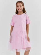 Платье для девочек свободного силуэта с отрезной юбкой. Горловина округлой формы обработана обтачкой из рибаны. Рукава втачные, корткие. Юбка трехслойная на сборке. Верхние два слоя из полотна трикотажного сетки, подкладка из полотна трикотажного кулирного.