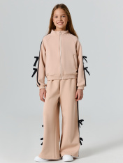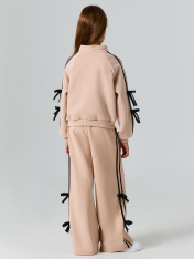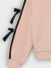 Толстовка свободного силуэта. В горловину втачен воротник-стойка. Рукава- реглан. По низу рукава манжеты из рибаны На рукавах настрочены лампасы и бантики из кулирного полотна. По переду застежка на молнию. На деталях переда прорезные карманы. По низу изделия отрезной пояс из рибаны._x000D_ _x000D_ _x000D_ _x000D_ _x000D_