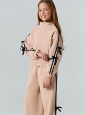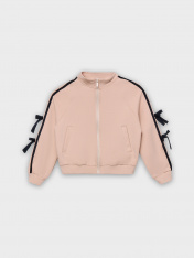 Толстовка свободного силуэта. В горловину втачен воротник-стойка. Рукава- реглан. По низу рукава манжеты из рибаны На рукавах настрочены лампасы и бантики из кулирного полотна. По переду застежка на молнию. На деталях переда прорезные карманы. По низу изделия отрезной пояс из рибаны._x000D_ _x000D_ _x000D_ _x000D_