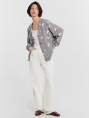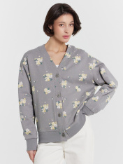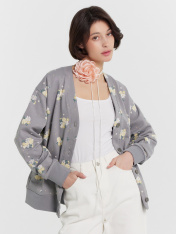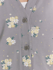 Женский кардиган свободного кроя с V-образной горловиной и цветочным принтом станет универсальным дополнением гардероба. Модель с длинными рукавами на эластичных манжетах и спущенной линией плеча обеспечивает комфорт и свободу движений. Застежка на пуговицы и практичные боковые карманы добавляют функциональности.<br>_x000D_ <br>_x000D_ Мягкий материал на основе хлопка сохраняет тепло в прохладную погоду, обеспечивая воздухообмен и приятные тактильные ощущения. Нежный цветочный узор на сером фоне создает акцент в образе. Плотное плетение ткани обеспечивает износостойкость и сохранение формы после многократного использования._x000D_ Универсальный фасон легко сочетается с брюками, джинсами и юбками. Элегантный крой подходит для создания повседневных образов, сохраняя комфорт в течение всего дня. Кардиган станет практичным решением для прохладного сезона._x000D_ _x000D_ _x000D_ _x000D_ _x000D_ _x000D_ _x000D_