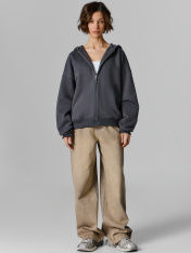 Эта женская толстовка на молнии станет стильным и удобным дополнением вашего гардероба. Футер, из которого выполнена модель, обеспечивает мягкость и тепло, необходимые для прохладных дней. Свободный силуэт гарантирует максимальный комфорт и современный стиль, а капюшон добавляет дополнительную защиту от непогоды. Центральная застежка на тесьму-молнию обеспечивает удобство в носке. Длинные рукава с эластичными манжетами из рибаны и спущенное плечо подчеркивают современный стиль толстовки. В боковых швах расположены карманы с подкладкой из кулирки, что делает эту модель еще более практичной и удобной._x000D_ _x000D_ _x000D_