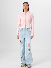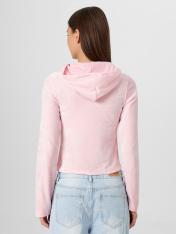 Женская велюровая толстовка полуприлегающего силуэта — это стильная и уютная модель, созданная для комфортных образов в прохладное время года. Укороченная длина подчеркивает актуальность дизайна и делает изделие идеальным для сочетания с брюками илиджинсами с высокой посадкой. Круглая горловина переходит в капюшон, который дополнен подкладкой из мягкой кулирки — это не только эстетично, но и практично, особенно в ветреную погоду. Центральная застежка на тесьму-молнию обеспечивает удобство в носке и позволяет легко регулировать степень открытости. Длинные рукава и нижние срезы изделия обработаны швом вподгибку, что подчеркивает аккуратность исполнения и сохраняет форму после стирок. Велюровая ткань дарит приятные тактильные ощущения, обладает легким блеском и хорошо сохраняет тепло, делая толстовку идеальной для домашних образов, прогулок или расслабленного городского стиля.