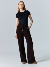 Брюки прямые с посадкой на талии свободного силуэта. Спереди карманы с отрезным бочком, с подкладкой из кулирного полотна. Пояс отрезной с эластичной тесьмой внутри 60RV. На внешней стороне петли, через которые выводится шнур с металлическими эглетами (8EKXWCp-1). Нижние срезы брюк обработаны швом вподгибку._x000D_ _x000D_ _x000D_ _x000D_ _x000D_ _x000D_ _x000D_ _x000D_