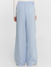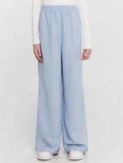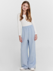 Брюки для девочек широкие. Посадка высокая. Пояс цельнокроеный из основного полотна, застрочен с эластичной тесьмой RV40 внутри, по поясу проложены отделочные строчки. В боковых швах обработаны карманы. Низ брюк обработан швом в подгибку.