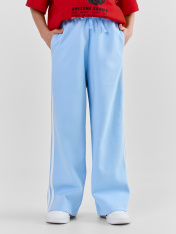Брюки прямые свободные, посадка средняя. Пояс отрезной, с эластичной тесьмой внутри (внутренняя 40мм 40RV). С внешней стороны пробиты петли и вставлен шнур 10PX-2. В боковых швах обработаны карманы. По бокам лампасы из кулирного полотна. Нижний срез брюк обработан швом вподгибку.