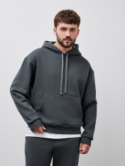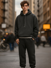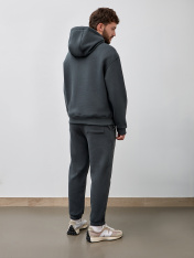 Комплект состоит из худи и джогеров._x000D_ Худи прямого силуэта. Горловина округлой формы с капюшоном. Капюшон двухшовный на подкладке из основного полотна. На внешней стороне пробиты петли и втянут шнур с эглетами (8EКXWCp-1)._x000D_ Рукав втачной, длинный сотрезными манжетами из рибаны. Линия плеча спущена.По переду накладной карман кенгуру.По низу худи отрезной пояс из рибаны._x000D_ Джогеры прямые, зауженные к низу._x000D_ Пояс отрезной с эластичной тесьмой внутри. С внутренней стороны пояса пробиты петли и втянут _x000D_ шнур с эглетами (8EКXWCp-1).В боковых швах обработаны карманы - хулиганы, подкладка карман из кулирки._x000D_ На задней правой половинке накладной карман, по заданию. Нижние срезы брюк обработаны швом вподгибку с эластичной тесьмой внутри.