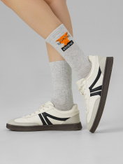 рис.2665 Женский носок с высоким плотным бортом и рисунком в виде котика с надписью.