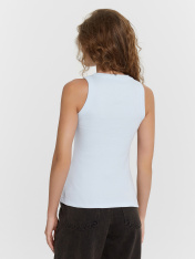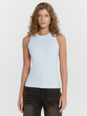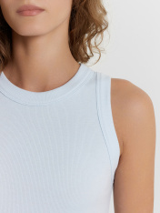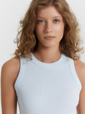 Топ женский из рибаны._x000D_ Узкое плечо, углубленная пройма._x000D_ Силуэт облегающий, длиной ниже уровня талии._x000D_ Перед и спинка цельнокроеные._x000D_ Горловина круглая, плотно прилегающая к шее._x000D_ Горловина и проймы окантованы широкой бейкой из основного полотна._x000D_ Низ изделия обработан швом вподгибку на плоскошовной машине.