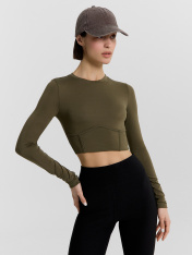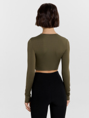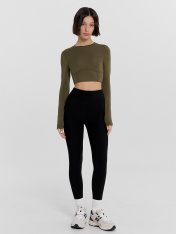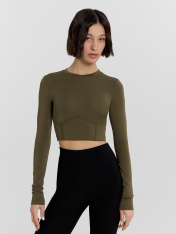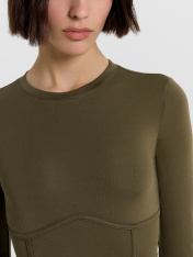 Джемпер изготовлен из трикотажного полотна интерлок. Джемпер облегающего силуэта, укороченный. Горловина округлой формы, обработана обтачкой из основного полотна. Джемпер с фигурным подрезом под грудью. Нижняя часть переда на подкладке из основного полотна. На нижней части и по фигурному подрезу настрочены лампасы из основного полотна. Рукав втачной длинный. Низ топа и рукавов обработан швом вподгибку.