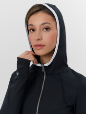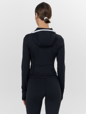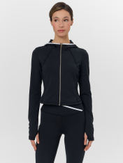 Толстовка на молнии с капюшоном создана для активного образа жизни. Укороченная модель прилегающего силуэта с длинными рукавами обеспечивает полную свободу движений во время тренировок. Специальные разрезы в швах рукавов позволяют фиксировать ткань при помощи большого пальца, что особенно удобно при физических нагрузках.<br>_x000D_ <br>_x000D_ Функциональный дизайн включает капюшон с усиленными бейками по краю и потайной карман на спинке для безопасного хранения мелочей. Фигурные рельефные швы спереди и сзади не только добавляют стильный акцент, но и улучшают посадку изделия по фигуре. Центральная застежка-молния обеспечивает удобство использования.<br>_x000D_ <br>_x000D_ Состав с преобладанием полиэстера и добавлением эластана гарантирует прочность ткани и идеальное облегание. Материал сохраняет форму после интенсивного использования и многократных стирок. <br>_x000D_ Толстовка станет надежным спутником для тренировок, пробежек и повседневной носки, сочетая спортивный функционал с современным дизайном._x000D_