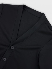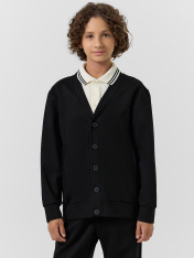 Жакет для мальчиков прямого силуэта. Спинка цельнокроенная, перед с центральной застежкой на пуговицы. Пуговицы на отрезной планке. Горловина V-вырез. _x000D_ Боковые швы перенесены на переднюю деталь, карманы в швах._x000D_ Рукав втачной, одношовный, длинный. _x000D_ _x000D_ _x000D_ _x000D_ _x000D_