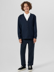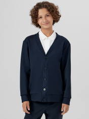 Жакет для мальчиков прямого силуэта. Спинка цельнокроенная, перед с центральной застежкой на пуговицы. Пуговицы на отрезной планке. Горловина V-вырез. _x000D_ Боковые швы перенесены на переднюю деталь, карманы в швах._x000D_ Рукав втачной, одношовный, длинный. _x000D_ _x000D_ _x000D_ _x000D_ _x000D_