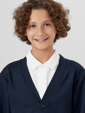 Кардиган для мальчиков прямого силуэта — универсальная и стильная модель, идеально подходящая для школьного гардероба. Классический V-образный вырез и центральная застёжка на пуговицы придают образу аккуратность и строгость, соответствующую требованиям учебного дресс-кода. Втачные карманы в боковых швах сохраняют лаконичный внешний вид и добавляют практичности, позволяя удобно разместить необходимые мелочи. Длинные рукава обеспечивают комфорт в прохладную погоду, делая кардиган пригодным как для учебных помещений, так и для прогулок. Материал "академик" отличается прочностью и устойчивостью к износу, хорошо держит форму и обеспечивает приятные тактильные ощущения. Такая модель легко сочетается с рубашкой, галстуком, школьными брюками или джинсами — отличный вариант для создания сдержанного, опрятного и комфортного образа на каждый день._x000D_ _x000D_ _x000D_ _x000D_ _x000D_