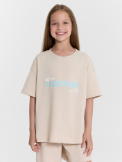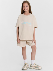 Комплект для девочек состоит из футболки и шорт. _x000D_ Футболка свободного силуэта. Перед и спинка цельнокроеные. Длина до середины бедра. Рукав втачной, короткий. Горловина круглой формы, обтачка из рибаны. Низ изделия и рукваов обработан на 2-х игольной плоскошовной машине швом в подгибку._x000D_ Шорты длиной немного выше колен. Пояс цельнокроеный, застрочен с эластичной резиной и распошит. Внутри по центру пояса пробиты петли, втянут шнур. Концы шнура застрочены. Низ шорт обработан швом в подгибкуна 2-х игольной плоскошовной машине.