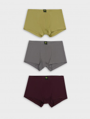 Набор трусов мужских в количестве 3 штук изготовлен из трикотажного полотна кулирного переплетения. Прилегающие, без боковых швов. Планка с средним швом. Шаговый шов выполнен строчкой "флэт-лок". Верхний край трусов застрочен с эластичной тесьмой на плоскошовной машине.