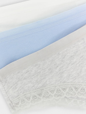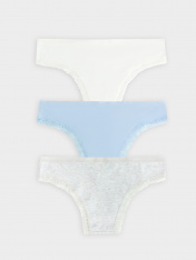 Мультипак (3 штуки) хлопковых слип-бикини из натурального, гипоаллергенного, дышащего полотна. Линия талии невысокая. По поясу и ножкам – нежная кружевная лента. Отличный повседневный вариант в базовой расцветке!