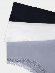 Набор из трех женских трусов-слипов в разных цветах — это идеальное сочетание комфорта и изящных деталей. Модели с невысокой посадкой выполнены из мягкого хлопка с добавлением эластана, который обеспечивает нежное облегание и свободу движений. Изящная кружевная лента по поясу и ножкам добавляет образу женственности, оставаясь комфортной в носке.<br>_x000D_ <br>_x000D_ Анатомичная конструкция и плоские швы бережно касаются кожи, не создавая натирания, а тонкие резинки мягко фиксируют трусики, не оставляя следов. Натуральный состав ткани обеспечивает воздухообмен и приятные тактильные ощущения в течение всего дня. Универсальный фасон подойдет для повседневной носки, занятий спортом или отдыха. Практичный набор станет надежным выбором для тех, кто ценит в нижнем белье качество, удобство и нежный дизайн._x000D_