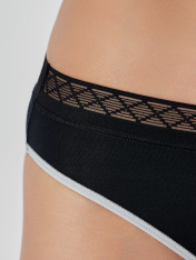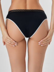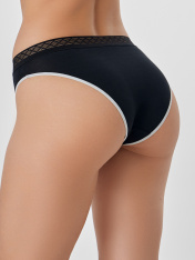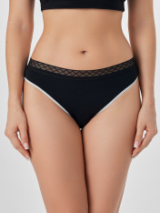 Слип-бикини из натурального хлопкового полотна – гипоаллергенного и приятного на ощупь. Линия талии завышена, бедра открыты. Верхний срез обработан декоративной тесьмой, по ножкам – жилка. Рекомендуем!